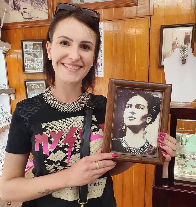 No ano de 2020, assim, antes do início da pandemia de coronavírus, que nos limitou de formas que pareciam impossíveis, eu tive a oportunidade de ir à capital do México, de conversar pessoalmente com esta importante escritora, a qual me recebeu com muito carinho, e de conhecer importantes espaços onde morou e por onde circulou Frida Kahlo, além de ver pessoalmente as pinturas que sempre me fascinaram. Nesse contexto, meu percurso começou pela Casa Azul, principal residência da pintora – uma fascinante construção que foi herança de seus pais e que vivenciou importantes momentos históricos, como a Revolução Mexicana, quando Frida ainda era muito pequena, e o conturbado matrimônio de Frida e Diego Rivera, além de ter recebido importantes figuras do meio artístico, como André Breton, líder do Movimento Surrealista, e do meio político, como Leon Trotsky, marxista e revolucionário bolchevique.