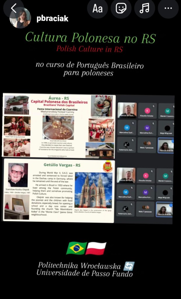 Não menos importante e muito motivadora é a oferta de cursos de curta duração para estudantes poloneses que residem nas cidades de Lublin e Wroclaw, na Polônia. A partir do contato entre a AI UPF e o PPGL com as instituições daquele país, nasceu, no segundo semestre de 2024, a proposta de verificar o interesse de estudantes das universidades Maria Skłodowska Curie (Lublin), Wrocław University of Science and Technology e University of Wrocław (Wrocław) em realizar cursos de língua portuguesa de curta duração.